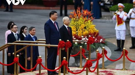 (VOVWORLD) - ตามคำเชิญของท่าน เหงวียนฟู้จ่อง เลขาธิการใหญ่พรรคคอมมิวนิสต์เวียดนามและภริยา นาย หวอวันเถือง ประธานประเทศและภริยา วันที่ 12 ธันวาคม นาย สีจิ้นผิง เลขาธิการใหญ่พรรคคอมมิวนิสต์จีนและประธานประเทศจีนพร้อมภริยาได้เดินทางมาเยือนเวียดนามอย่างเป็นทางการ