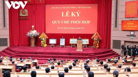 (VOVWORLD) - เมื่อค่ำวันที่ 6 ธันวาคม ณ กรุงฮานอย กระทรวงความมั่นคงสาธารณะ กระทรวงกลาโหมและกระทรวงการต่างประเทศได้จัดพิธีลงนามระเบียบการประสานงานสามฝ่ายโดยมีเลขาธิการใหญ่พรรค โตเลิม ประธานประเทศ เลืองเกื่อง และนายกรัฐมนตรี ฝ่ามมิงชิ้ง เข้าร่วม