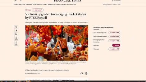 (VOVWORLD) -สื่อมวลชนและนักวิชาการอังกฤษประเมินในเชิงบวกต่อการที่ผู้ให้บริการดัชนี FTSE Russell ประกาศยกระดับสถานะ "ตลาดหุ้นเวียดนาม" จากตลาดชายขอบเป็นตลาดเกิดใหม่