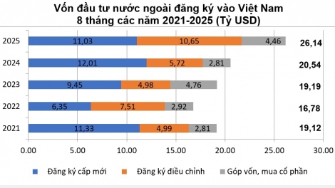 มูลค่าการลงทุนโดยตรงจากต่างประเทศของเวียดนามช่วง 8 เดือนแรกของปี 2025 ทำสถิติสูงสุดในรอบ 5 ปี