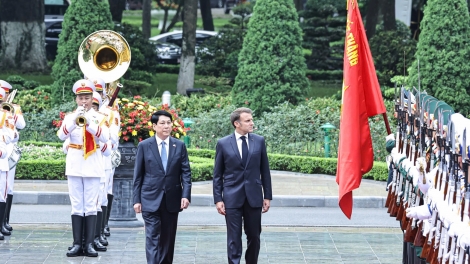 ประธานประเทศ เลืองเกื่อง เป็นประธานในพิธีต้อนรับและเจรจากับประธานาธิบดีฝรั่งเศส เอ็มมานูเอล มาครง