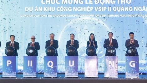 (VOVWORLD) - เช้าวันที่ 12 มีนาคม พิธีวางศิลาฤกษ์ก่อสร้างโครงการการลงทุนและธุรกิจโครงสร้างพื้นฐานของเขตนิคมอุตสาหกรรม VSIP II กว๋างหงาย ได้มีขึ้น ณ อำเภอบิ่งเซิน จังหวัดกว๋างหงาย โดยมีประธานสภาแห่งชาติ เจิ่นแทงเหมิน เข้าร่วม