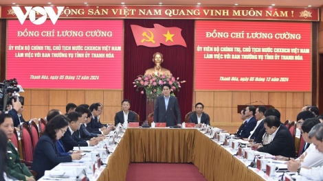 (VOVWORLD) -ในกรอบการลงพื้นที่ในจังหวัดแทงฮว้า เช้าวันที่ 5 ธันวาคม ประธานประเทศ เลืองเกื่อง ได้ประชุมกับคณะกรรมการพรรคสาขาจังหวัดแทงฮว้าเกี่ยวกับสถานการณ์การพัฒนาเศรษฐกิจ-สังคม
