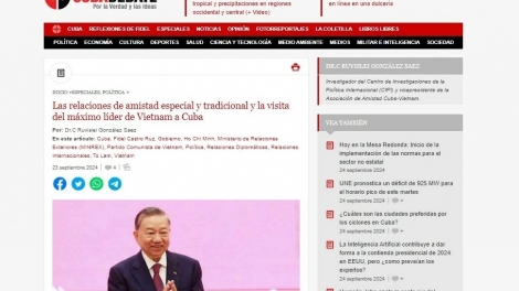 (VOVWORLD) - สื่อคิวบารายงานว่า การเยือนคิวบาของเลขาธิการใหญ่พรรค ประธานประเทศเวียดนาม โตเลิม ในระหว่างวันที่ 25-27 กันยายนจะสร้างพลังขับเคลื่อนใหม่ให้แก่ความสัมพันธ์ฉันท์พี่น้องระหว่างประชาชาติเวียดนามและประชาชาติคิวบา