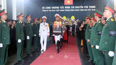 (VOVWORLD) -เลขาธิการใหญ่พรรค เหงวียนฟู้จ่องถึงแก่อสัญกรรมเมื่อวันที่ 19 กรกฎาคมปี 2024 ซึ่งสร้างความเสียใจอย่างสุดซึ้งต่อพรรค รัฐ ประชาชนเวียดนามและเพื่อนมิตรชาวต่างชาติ คณะกรรมการกลางพรรคคอมมิวนิสต์เวียดนาม สภาแห่งชาติเวียดนาม ประธานประเทศเวียดนาม รัฐบาลเวียดนาม แนวร่วมปิตุภูมิเวียดนามได้จัดพิธีศพท่านเลขาธิการใหญ่พรรค เหงวียนฟู้จ่องตามแบบรัฐพิธี