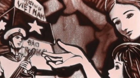 (VOVworld) - ตามเนื้อหาของบทกวี “แม่เล่าให้ลูกฟัง” ของคุณเยืองฝาม ศิลปินเลฟองยาวได้วาดภาพด้วยทรายเพื่อปลูกฝังจิตสำนึกเกี่ยวกับความรักชาติ รักทะเลและเกาะแก่งของประชาชนเวียดนาม