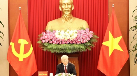 เลขาธิการใหญ่พรรคฯ เหงวียนฟู้จ่องพูดคุยทางโทรศัพท์กับสมเด็จฮุนเซน นายกรัฐมนตรีกัมพูชา