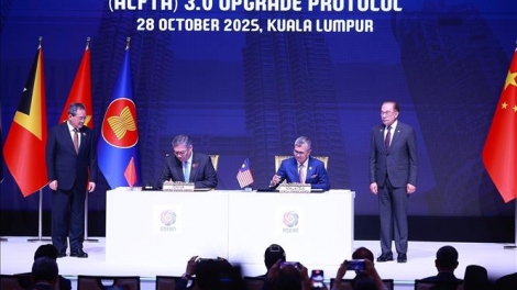 (VOVWORLD) - วันที่ 28 ตุลาคม จีนและอาเซียนได้ลงนามในพิธีสารอัพเกรดเขตการค้าเสรีจีน-อาเซียน หรือ FTA เวอร์ชัน 3.0 ซึ่งแสดงให้เห็นถึงคำมั่นต่อลัทธิพหุภาคี การค้าเสรี มุ่งสู่การสร้างตลาดที่เปิดกว้าง ครอบคลุม อาศัยกฎหมาย มีระบบนิเวศห่วงโซ่การผลิตและอุปทานที่มีความยืดหยุ่นในภูมิภาค