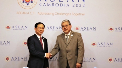 (VOVWORLD) -ในกรอบการเยือนประเทศกัมพูชาอย่างเป็นทางการและเข้าร่วมการประชุมสุดยอดอาเซียนครั้งที่ 40 และ 41 และการประชุมต่างๆที่เกี่ยวข้องของนายกรัฐมนตรีเวียดนาม บ่ายวันที่ 9 พฤศจิกายน ณ กรุงพนมเปญ ประเทศกัมพูชา นาย บุ่ยแทงเซิน รัฐมนตรีว่าการกระทรวงการต่างประเทศเวียดนามได้พบปะหารือกับรัฐมนตรีว่าการกระทรวงการต่างประเทศฟิลิปปินส์ Philippines Enrique Manalo