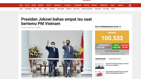 (VOVWORLD) - ในโอกาสการเยือนต่างประเทศครั้งแรกในฐานะนายกรัฐมนตรีเวียดนาม ท่าน ฝ่ามมิงห์ชิ้ง ได้เดินทางถึงกรุงจาการ์ตา ประเทศอินโดนีเซีย เพื่อเข้าร่วมการประชุมผู้นำอาเซียนในระหว่างวันที่ 23-24 เมษายน นิตยสารวิจัยเอเชีย – ยุโรปหรือ Eurasia Reviewออนไลน์วันที่ 23 เมษายน ได้ลงบทความที่แสดงความเชื่อมั่นต่อความสัมพันธ์ยุทธศาสตร์ที่นับวันแน่นแฟ้นมากขึ้นระหว่างเวียดนามกับอินโดนีเซีย พร้อมทั้งชื่นชมผลสำเร็จของเวียดนามในเวลาที่ผ่านมา