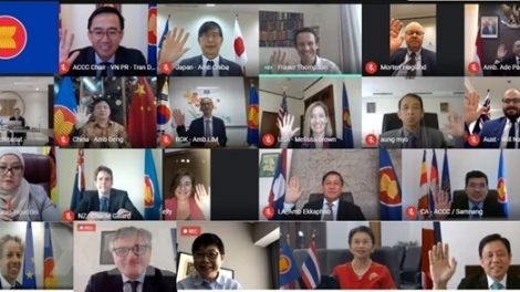 (VOVWORLD) - เมื่อวันที่ 28 มกราคม ได้มีการจัดการประชุมคณะกรรมการประสานงานการเชื่อมโยงอาเซียนครั้งแรกในปี 2021 ผ่านวิดีโอคอนเฟอเรนซ์ ซึ่งคณะผู้แทนเวียดนามนำโดยเอกอัครราชทูตเจิ่นดึ๊กบิ่ง หัวหน้าคณะผู้แทนเวียดนามประจำอาเซียนได้เข้าร่วมการประชุมดังกล่าว