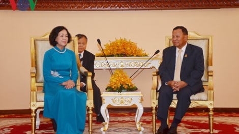 (VOVWORLD) - ในกรอบการเยือนประเทศกัมพูชาเมื่อเช้าวันที่ 27 ตุลาคม ณ กรุงพนมเปญ คณะผู้แทนระดับสูงพรรคคอมมิวนิสต์เวียดนามนำโดยนาง เจืองถิมาย สมาชิกกรมการเมืองพรรคและหัวหน้าคณะกรรมการรณรงค์มวลชนส่วนกลางได้เข้าเยี่ยมคารวะสมเด็จ สายชุม ประธานวุฒิสภาและรองหัวหน้าพรรคประชาชนกัมพูชา