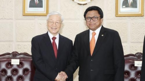 (VOVWORLD) - ในกรอบการเยือนอินโดนีเซีย วันที่ 22 สิงหาคม ณ อาคารรัฐสภาอินโดนีเซีย ท่าน เหงียนฟู้จ่อง เลขาธิการใหญ่พรรคคอมมิวนิสต์เวียดนามได้เข้าพบประธานสภาล่างอินโนดีเซีย Setya Novanto