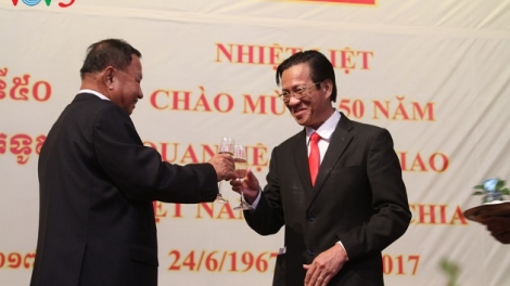 (VOVWORLD) -เมื่อค่ำวันที่22มิถุนายน สถานทูตเวียดนามประจำประเทศกัมพูชาได้จัดพิธีฉลองครบรอบ50ปีการสถาปนาความสัมพันธ์ทางการทูตระหว่างเวียดนามกับกัมพูชา 24มิถุนายน โดยมีสมเด็จ ไซชุม ประธานวุฒิสภากัมพูชา เจ้าหน้าที่ระดับสูงของวุฒิสภา รัฐสภา รัฐบาล กระทรวงและหน่วยงานต่างๆของกัมพูชาเข้าร่วม