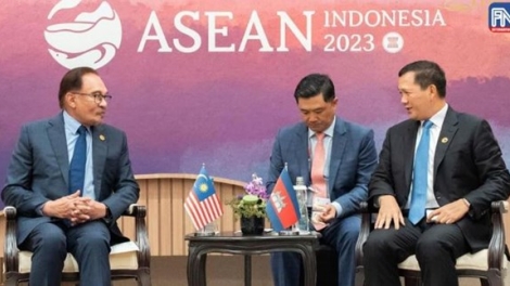 (VOVWORLD) - วันที่ 5 กันยายน นอกรอบการประชุมผู้นำอาเซียนครั้งที่ 43 ณ กรุงจาการ์ตา ประเทศอินโดนีเซีย พลเอก ฮุน มาเนต นายกรัฐมนตรีกัมพูชาได้พบปะทวิภาคีกับนายAnwar Ibrahim นายกรัฐมนตรีมาเลเซียและนาย ลีเซียนลุง นายกรัฐมนตรีสิงคโปร์