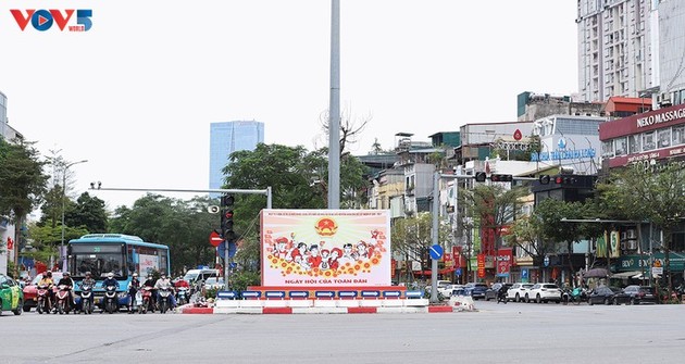ป้ายคำขวัญต้อนรับวันเลือกตั้งถูกติดตั้งตามจุดตัดการจราจรสำคัญหลายแห่งในกรุงฮานอย มีส่วนช่วยเผยแพร่ข้อมูลประชาสัมพันธ์ และนำวันมหกรรมของประชาชนเข้าใกล้ชีวิตประจำวันของชาวเมืองหลวงมากยิ่งขึ้น