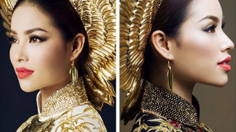 (VOVWorld)-ขอแนะนำภาพถ่ายเกี่ยวกับชุดประจำชาติอ๊าวหย่ายที่นางสาวฝามเฮือง มิสยูนิเวิร์สเวียดนาที่ใส่ในการประกวดมิสยูนิเวิร์สโลกปี๒๐๑๕