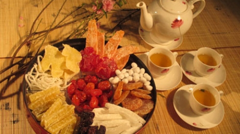 เพื่อฉลองตรุษเต๊ต นอกจากประดับประดาบ้านเรือนด้วยดอกท้อและต้นส้มจี๊ดหรือดอกไม้ชนิดต่างๆอย่างสวยงามแล้ว ชาวเวียดนามยังเตรียมขนมขบเคี้ยวและลูกอมเพื่อต้อนรับแขกที่มาเยือนและอวยพรปีใหม่ เช่น เมล็ดแตงโม เมล็ดฟักทอง ขนมขบเคี้ยวหรือลูกอม....