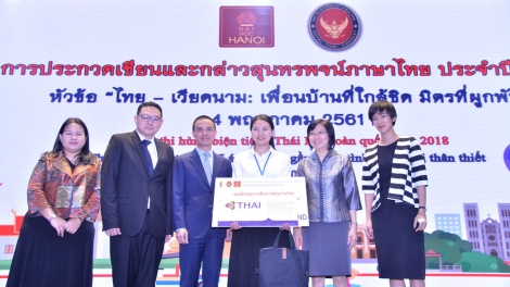 (VOVWORLD) -ในการประกวดกล่าวสุนทรพจน์ภาษาไทยทั่วประเทศครั้งที่๕รอบชิงชนะเลิศที่จัดโดยสถานทูตไทยประจำกรุงฮานอยและมหาวิทยาลัยฮานอย น.ส.หวอเจิ่นบ๋าวเจิน นักศึกษาจากมหาวิทยาลัยวิทยาศาสตร์ สังคมศาสตร์และมนุษยศาสตร์นครโฮจิมินห์ได้รับรางวัลที่๑ เนื่องจากเสียงพูดที่นุ่มนวล ความมีเสน่ห์บวกกับความสามารถด้านภาษาไทยที่ดีได้สร้างความประทับใจให้แก่คณะกรรมการตัดสินสำหรับ น.ส.หวอเจิ่นบ๋าวเจินการเข้าร่วมการประกวดกล่าวสุนทรพจน์ภาษาไทยครั้งนี้เป็นการแสดงให้เห็นถึงความรักภาษาไทยของเธอ