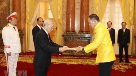 เลขาธิการใหญ่พรรค ประธานประเทศ เหงียนฟู้จ่อง ให้การต้อนรับบรรดาเอกอัครราชทูตที่เข้ายื่นสาส์นตราตั้ง