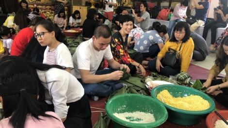 ชาวเวียดนามและนักศึกษาเวียดนามในกรุงเทพฯ ประเทศไทย ร่วมกันห่อขนมข้าวต้มมัดใหญ่เพื่อฉลองตรุษเต๊ตปีกุน 2019