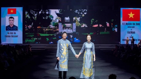 (VOVWORLD) - เมื่อวันที่ 1 ธันวาคมที่ผ่านมา เอกอัครราชทูตเวียดนามประจำประเทศไทย เหงียนหายบั่งและภริยาได้เข้าร่วมงาน มหกรรมผ้าไหม 2561 ไหมไทยสู่เส่นทางโลก ครั้งที่ 8 โดยแสดงชุดประจำชาติของเวียดนามของนักออกแบบ หวูเวียดห่า ซึ่งสร้างความประทับใจเป็นอย่างมากให้แก่ผู้เข้าชมงาน