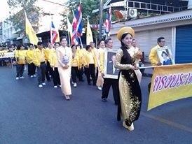 Bước sang tháng cuối cùng cuả năm 2013 . Chào mừng đất nước Việt Nam ngày càng vững mạnh,hiến pháp sửa đổi đã được thông qua,Việt Nam vừa được bầu vào uỷ ban nhân quyền với số phiếu cao nhất. Đây là một thắng lợi lớn về chính trị cũng như ngọai giao của Đảng chính phủ ta.Trên đất nước Thái Lan cũng vừa tổ chức thành công ngày sinh nhật lần thứ 86 nhà Vua, Người mà nhân dân Thái kính trọng nhất. Trong ngày này để tỏ lòng tôn kính nhà vua và để xây dựng tình hữu nghị giữa Hội người Việt Nam ở nước ngoài và nhân dân bạn Thái. Chúng tôi cũng hưởng ứng và tham gia diễu hành ,ban đêm hàng triệu ngọn nến được thắp lên cầu nguyện cho sức khỏe nhà vua, mãi mãi trường thọ,là niềm hạnh phúc của toàn dân. Cuối cùng xin chúc sức khỏe ban biên tập, phát thanh viên thành công trong mọi lĩnh vực, có nhìêu niềm vui.Tôi xin kèm vài tấm ảnh