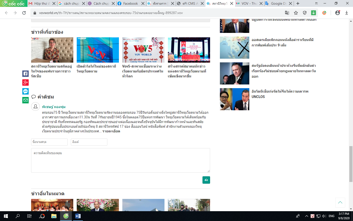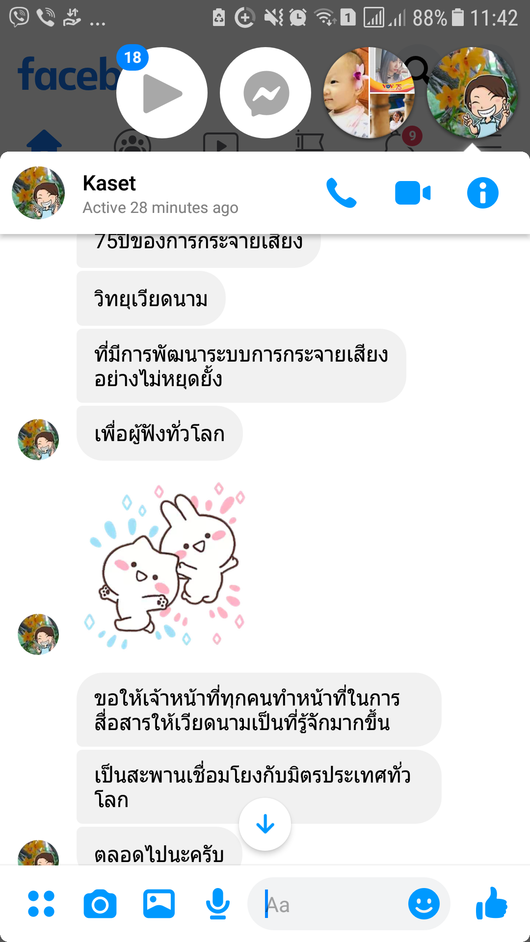 (VOVWORLD) - ในโอกาสนี้ขอแสดงความยินดีกับเจ้าหน้าที่ทุกภาคส่วนของสถานี โดยเฉพาะอย่างยิ่งภาคภาษาไทยซึ่งออกอากาศกันมานานแสนนาน เรียกว่าชั่วอายุของคนๆหนึ่งเลยทีเดียวๆ ผู้ฟังได้รับสาระความรู้มากมาย และยังช่วยกระชับความสัมพันธ์ของไทยกับเวียดนามให้แน่นแฟ้นยิ่งขึ้น สถานีนี้ให้ความเอาใจใส่ผู้ฟังเป็นอย่างดีมากทีเดียว ผมรู้สึกเป็นเกียรติอย่างมากที่ได้เป็นเพื่อนกันกับผู้ดำเนินรายการผ่านทางเฟสบุค...