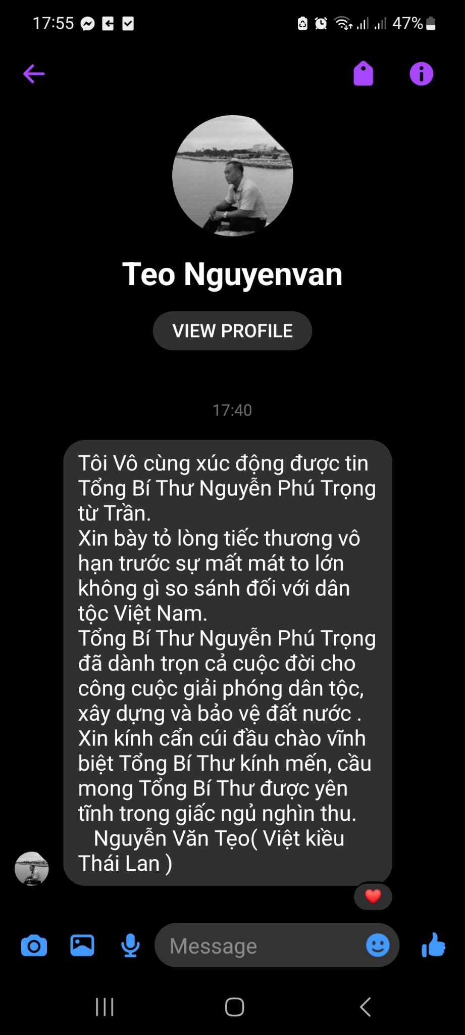 ผมรู้สึกเศร้าใจมากที่ได้ทราบข่าวเลขาธิการใหญ่พรรค เหงวียนฟู้จ่อง ถึงแก่กรรม ขอแสดงความเสียใจอย่างสุดซึ้งสำหรับการสูญเสียครั้งใหญ่ของชาวเวียดนาม