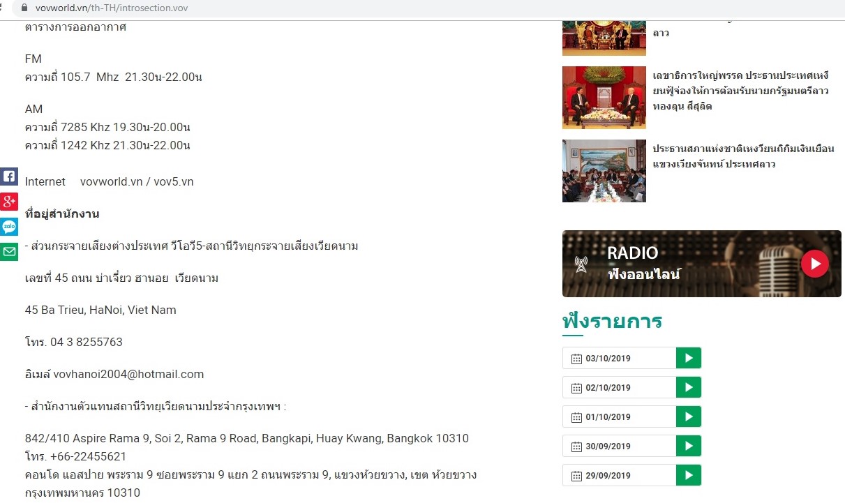ในสัปดาห์ที่ผ่านมา เราได้รับ inbox จากคุณ Wirayut Saensuk จากสถานีวิทยุมหาวิทยาลัยแม่โจ้ จังหวัดเชียงใหม่ที่ถามเกี่ยวกับการสร้างความร่วมมือและการนำรายการต่างๆของวีโอวีไปออกอากาศทางสถานีวิทยุมหาวิทยาลัยแม่โจ้ พร้อมทั้งเผยว่า มีแผนเดินทางมายังกรุงฮานอยในปลายเดือนตุลาคมเพื่อศึกษาเกี่ยวกับเรื่องดังกล่าวและถามว่า ทาง VOV ได้กระจายเสียงในประเทศไทย หรือเปล่า