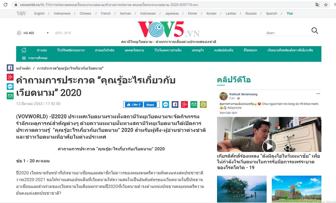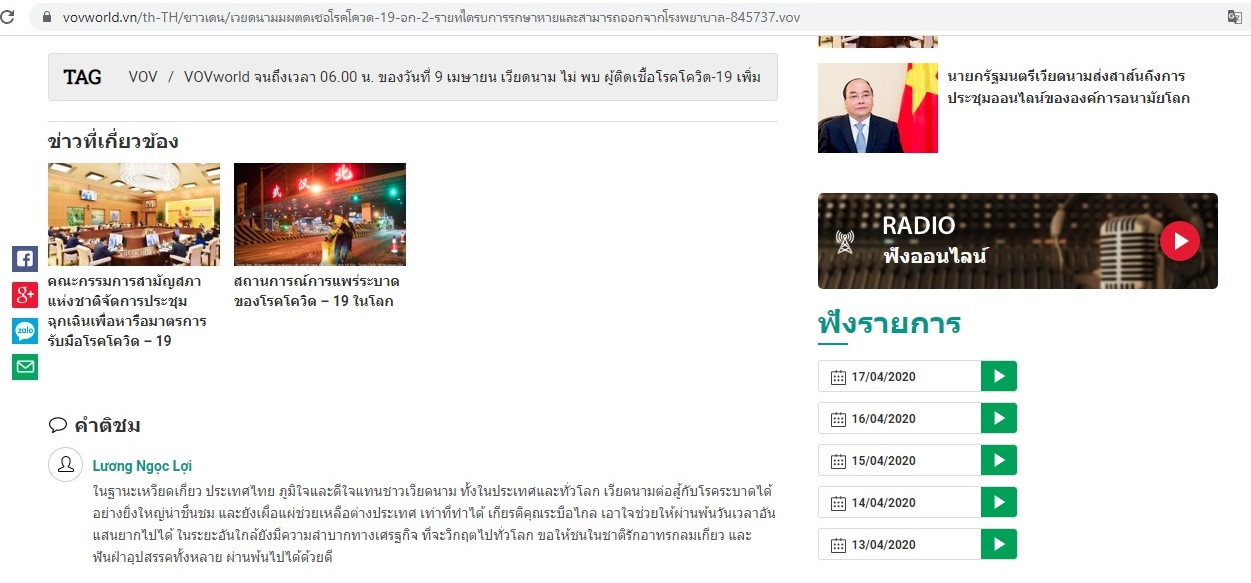 ก็เกี่ยวข้องกับประมวลภาพเกี่ยวกับทัศนียภาพที่เงียบสงบของฮานอยในช่วงเว้นระยะห่างทางสังคมที่ลงบนเว็บไซต์www.vovworld.vn และ fanpage VOV5-สะพานเชื่อมระหว่างเวียดนามกับมิตรประเทศในทั่วโลก มีคนที่กดไลค์กดแชร์หลายสิบครั้ง โดยเฉพาะคุณPiyapat Tangtrakoolpong ได้แชร์ผ่าน Facebook แล้วบอกว่า คิดถึงประเทศเวียดนามมาก