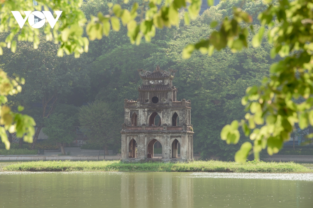 บริเวณเจดีย์เต่ากลางทะเลสาบคืนดาบในใจกลางกรุงฮานอยยามฤดูใบไม้ร่วง |