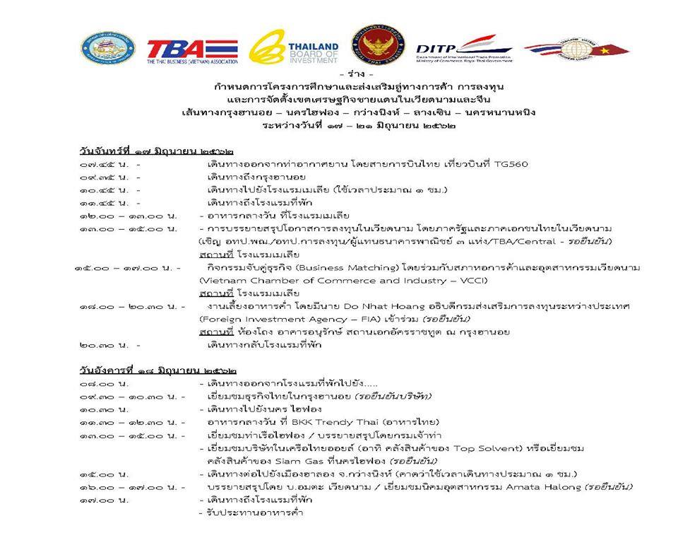 เราขอแจ้งข่าวเกี่ยวกับความสัมพันธ์ร่วมมือด้านการค้าและการลงทุนระหว่าง 2 ประเทศ ซึ่งนี่เป็นข้อมูลที่น่าสนใจสำหรับสถานประกอบการไทย นั่นคือโครงการศึกษาและส่งเสริมลู่ทางการค้า เศรษฐกิจ การลงทุน และการจัดตั้งเขตเศรษฐกิจชายแดนในเวียดนามและจีน ในเส้นทางกรุงฮานอย-นครไฮฟอง-กว่างนิงห์-ลางเซิน-นครหนานหนิง โดยสถานเอกอัครราชทูตไทย ณ กรุงฮานอยเป็นผู้ริเริ่ม ซึ่งจะมีขึ้นในระหว่างวันที่ ๑๗-๒๑ มิถุนายน ๒๕๖๒ โดยจะมีกิจกรรมต่าง ๆ อาทิ การบรรยายลู่ทางการลงทุน การจับคู่ธุรกิจ และการเยี่ยมชมท่าเรือไฮฟอง นิคมอุตสาหกรรม Amata City Halong เขตเศรษฐกิจในนครหนานหนิง