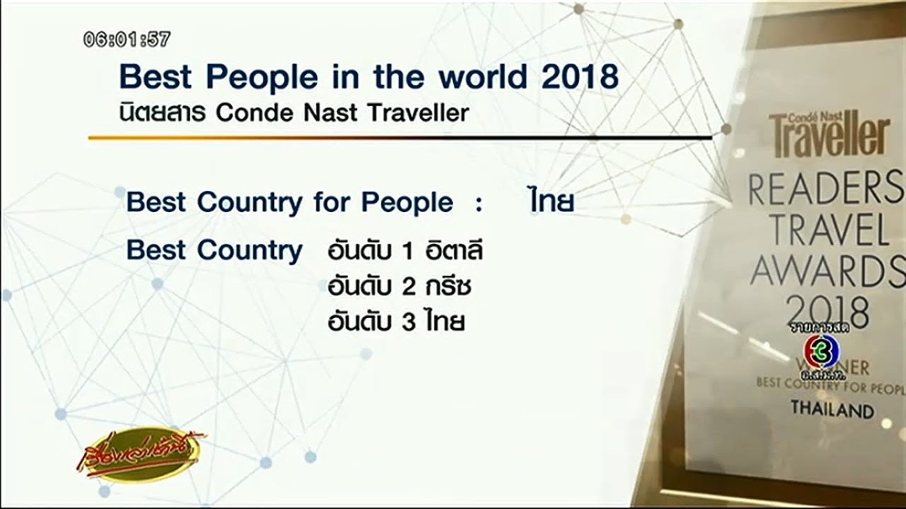 นิตยสาร Conde Nast Traveller ของสหรัฐได้โหวตให้คนไทยเป็น The best people in the world ปี 2018 และประเทศไทยอยู่อันดับ 3 ในการจัดอันดับ Best country ประจำปี 2018 รองจากอิตาลีและกรีซ