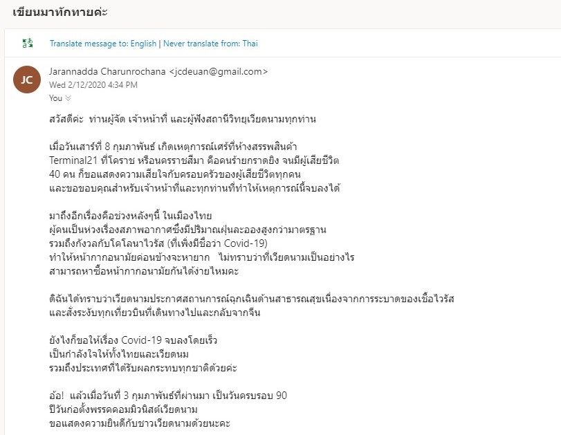 อีเมลของคุณจรัลนัดดา จรูญโรจน์ที่เขียนว่า “สวัสดีค่ะ ท่านผู้จัด เจ้าหน้าที่ และผู้ฟังสถานีวิทยุเวียดนามทุกท่าน เมื่อวันเสาร์ที่ 8 กุมภาพันธ์ เกิดเหตุการณ์เศร้าที่ห้างสรรพสินค้า Terminal21 ที่โคราช หรือนครราชสีมา คือคนร้ายกราดยิง จนมีผู้เสียชีวิต 40 คน ก็ขอแสดงความเสียใจกับครอบครัวของผู้เสียชีวิตทุกคนและขอขอบคุณสำหรับเจ้าหน้าที่และทุกท่านที่ทำให้เหตุการณ์นี้จบลงได้” ส่วนคุณพิเชษฐ์ ทองพุ่ม ได้คอมเมนต์ข่าวนายกรัฐมนตรีเวียดนามส่งโทรเลขไต่ถามเกี่ยวกับเหตุกราดยิงประชาชนในเมืองโคราชถึงพลเอกประยุทธ์ จันทร์โอชา นายกรัฐมนตรีไทยว่า “ติดตามข่าวด้วยความตกใจ อกสั่นขวัญ ที่หมู่บ้านผมใน กทม เงียบมากผิดปกติ เพราะผู้คนต่างคอยดูข่าวทางทีวี ตลาดเหงาเลยครับ”