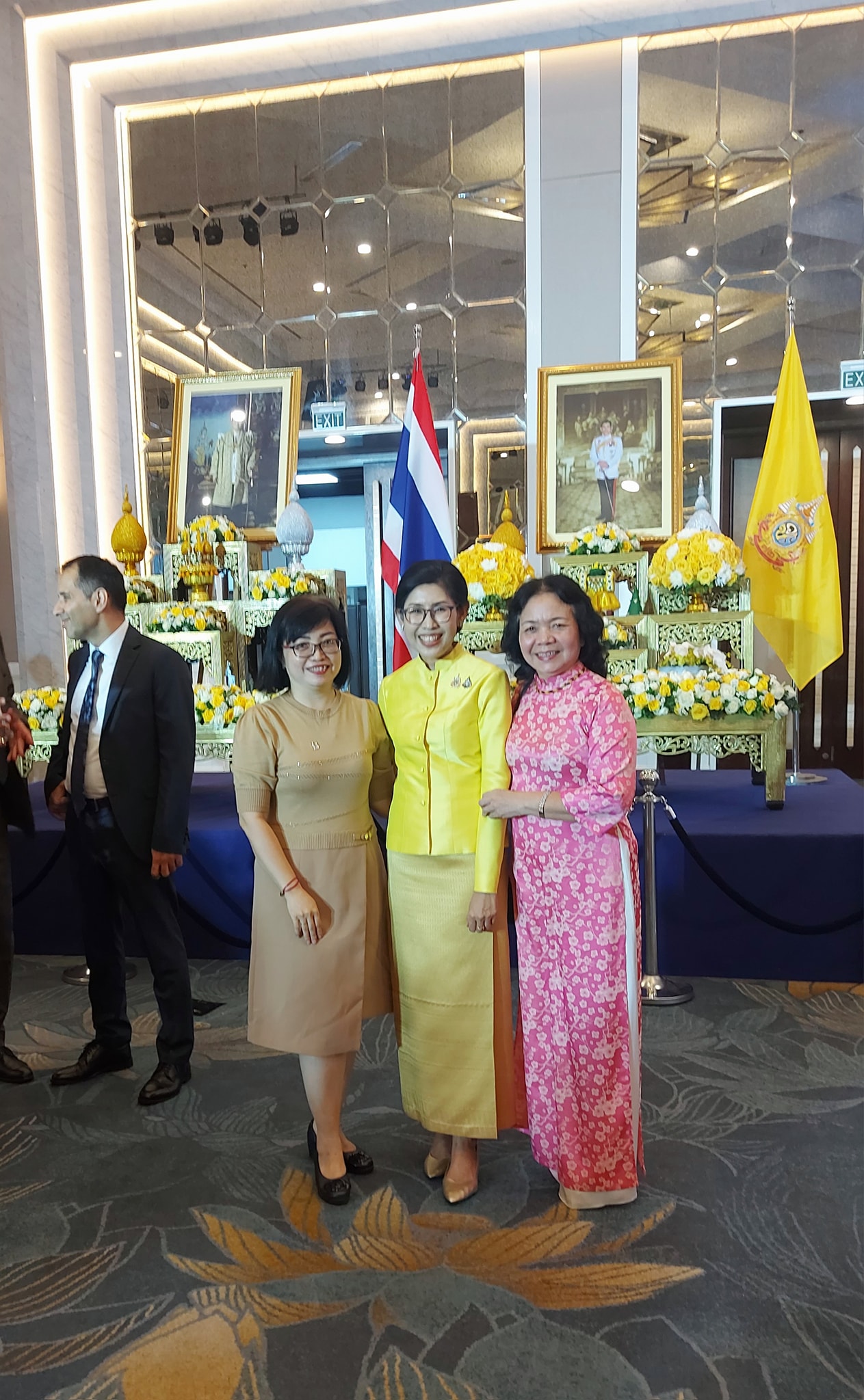 คุณ มิงเงวียด ซึ่งเป็นหัวหน้าภาคภาษาไทยคนปัจจุบันและคุณ แทงเหวี่ยน ซึ่งเป็นอดีตหัวหน้าภาคภาษาไทย สถานีวิทยุเวียดนามถ่ายรูปกับ นางสาว อุรวดี ศรีภิรมย์ เอกอัครราชทูตไทย ณ กรุงฮานอยในงานฉลองวันชาติไทยที่กรุงฮานอยเมื่อวันที่ 4 ธันวาคม |