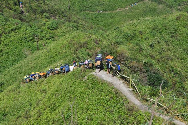 ส่วนอีกเส้นทางที่เริ่มจากจ๋ายโตนในความสูงเกือบ2000เมตรนั้นถือเป็นเส้นทางที่สั้นที่สุดโดยใช้เวลาทั้งขึ้นและลงเพียง2วันเท่านั้น ดังนั้นนักไต่เขามืออาชีพจะไม่นิยมเลือกหากมีแต่นักท่องเที่ยวที่มาพิชิตครั้งแรกหรือครอบครัวที่พาเด็กไปด้วยถึงจะนิยมเลือกใช้เส้นทางนี้