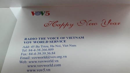 *** เรียน ผู้ดำเนินรายการภาคภาษาไทย วิทยุเวียตนาม ได้รับปฏิทิน และ ส.ค.ส. ประจำปี 2016 เรียบร้อยแล้ว ด้วยความขอบคุณยิ่ง ผมยังคงรับฟังรายการของท่าน ทางวิทยุคลื่นสั้น เวลา(ประเทศไทย) 19:30-20:00 ที่ 7285 KHz. เสียงดังฟังชัดดีมาก รายการต่างๆ มีโยชน์และให้ความรู้มากมาย