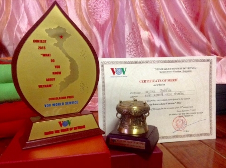 โล่หฺ์รางวัลที่สถานีวิทยุเวียตนามส่งมาให้ผมนั้นผมได้รับแล้ว ถึงจะนานไปหน่อยแต่ก็คุ้มค่า ตอนนี้ผมก็ได้รับของที่ระลึกครบแล้วขอขอบพระคุณสถานีที่กรุณาส่งมาให้ ผมชอบมาก