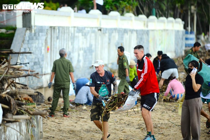 นักท่องเที่ยวต่างชาติช่วยเหลือประชาชนเวียดนามทำความสะอาดหลังน้ำท่วม ณ เมืองยาจาง |