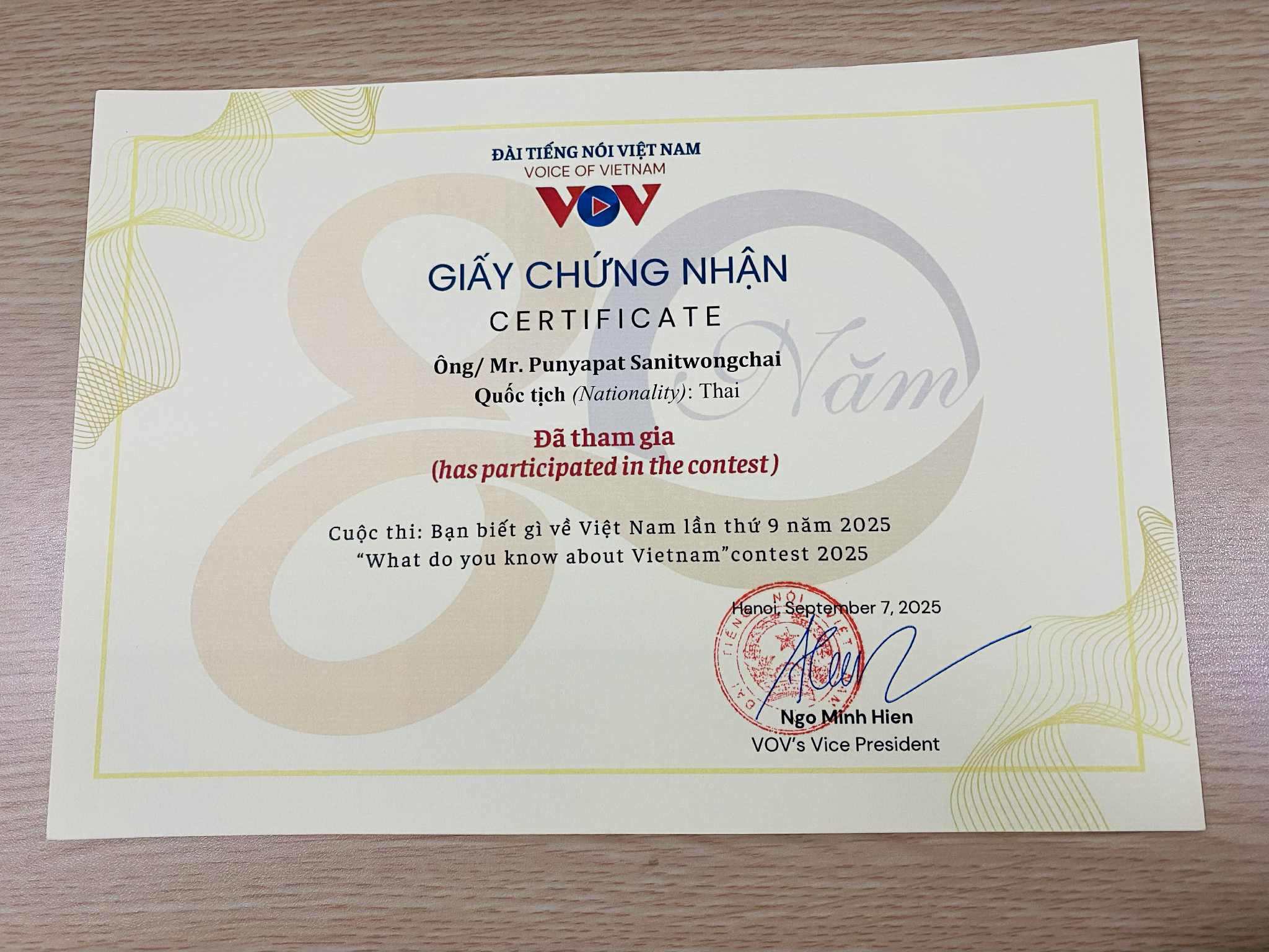 ใบรับรองสำหรับคุณผู้ฟังที่เข้าร่วมการประกวดคุณรู้อะไรเกี่ยวกับเวียดนามปี 2025 |