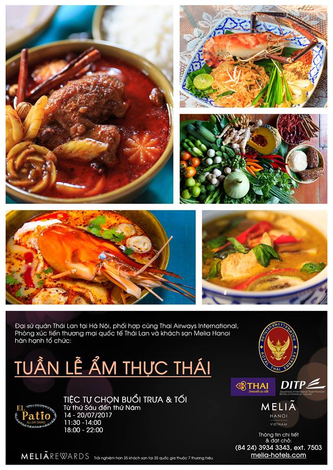 งานสัปดาห์อาหารไทยจัดที่โรงแรม Melia Hanoi ในระหว่างวันที่ 14-20 กรกฎาคม โดยในสัปดาห์อาหารไทย จะมีเชฟฝีมือดีจากกรุงเทพฯรวมทั้งหมด 4 คนมาทำอาหารให้ทาน จัดโดยสถานทูตไทยประจำเวียดนาม บริษัทการบินไทย มหาชนจำกัด สำนักงานส่งเสริมการค้าในต่างประเทศและโรงแรม Melia Hanoi นาย มานพชัย วงศ์ภักดี เอกอัครราชทูตไทย ณ กรุงฮานอยได้กล่าวถึงวัตถุประสงค์ของการจัดงานสัปดาห์อาหารไทยครั้งนี้ว่า “อาหารคือส่วนหนึ่งของวัฒนธรรมทุกชาติ มันเป็นสิ่งที่แสดงให้เห็นวิถีชีวิตเพราะว่าสิ่งเหล่านี้สะท้อนให้เห็นถึงวิถีชีวิตทางเกษตรกรรม พืชพันธุ์ธัญญาหารต่างๆที่มีอยู่ในประเทศไทย แล้วเราได้ประยุคนำสิ่งเหล่านั้นขึ้นมาสร้างเป็นวัฒนธรรมในด้านอาหารของไทย ซึ่งจะเห็นได้ว่ามีความหลากหลายมาก แล้วก็มีความผสมผสานทางวัฒนธรรมจากหลายแหล่ง แล้วเราก็เชื่อมั่นว่า ในสิ่งเหล่านี้ ในฐานะที่เป็นประเทศเพื่อนบ้านด้วยกัน ผมคิดว่าทั้งไทยและเวียดนามเราใช้โอกาสให้เรารู้จักมากและซึมซับวัฒนธรรมให้มากกว่า เพราะว่า ปกติแล้ว ถ้าเรามองไปในสังคมเอเชียในเมืองใหญ่ๆในปัจจุบัน เราจะเห็นได้ว่ามีร้านอาหารประเภท Fastfood ซึ่งส่วนใหญ่เป็นอาหารจากอีกซีกของโลก ซึ่งไม่ใช่อาหารของเอเซีย แต่ทำให้เยาวชนของเราส่วนใหญ่ในปัจจุบันก็จะคุ้นเคยกับอาหารทางด้านของ Fastfood พวกนี้มากกว่า ดังนั้นผมคิดว่าจำเป็นเป็นอย่างยิ่งที่เราจะต้องร่วมมือกันในการที่จะเผยแพร่วัฒนธรรมทางด้านอาหารระหว่างกันเพราะว่าอาหารไทยและอาหารเวียดนามก็มีหลายอย่างที่คล้ายคลึงกัน ส่วนที่แตกต่างกันก็มีแต่ว่าเราต้องร่วมกันที่จะส่งเสริมวัฒนธรรมอาหาร โดยเฉพาะในกลุ่มประเทศอาเซียด้วยกันให้เป็นที่รู้จักมากยิ่งขึ้น”