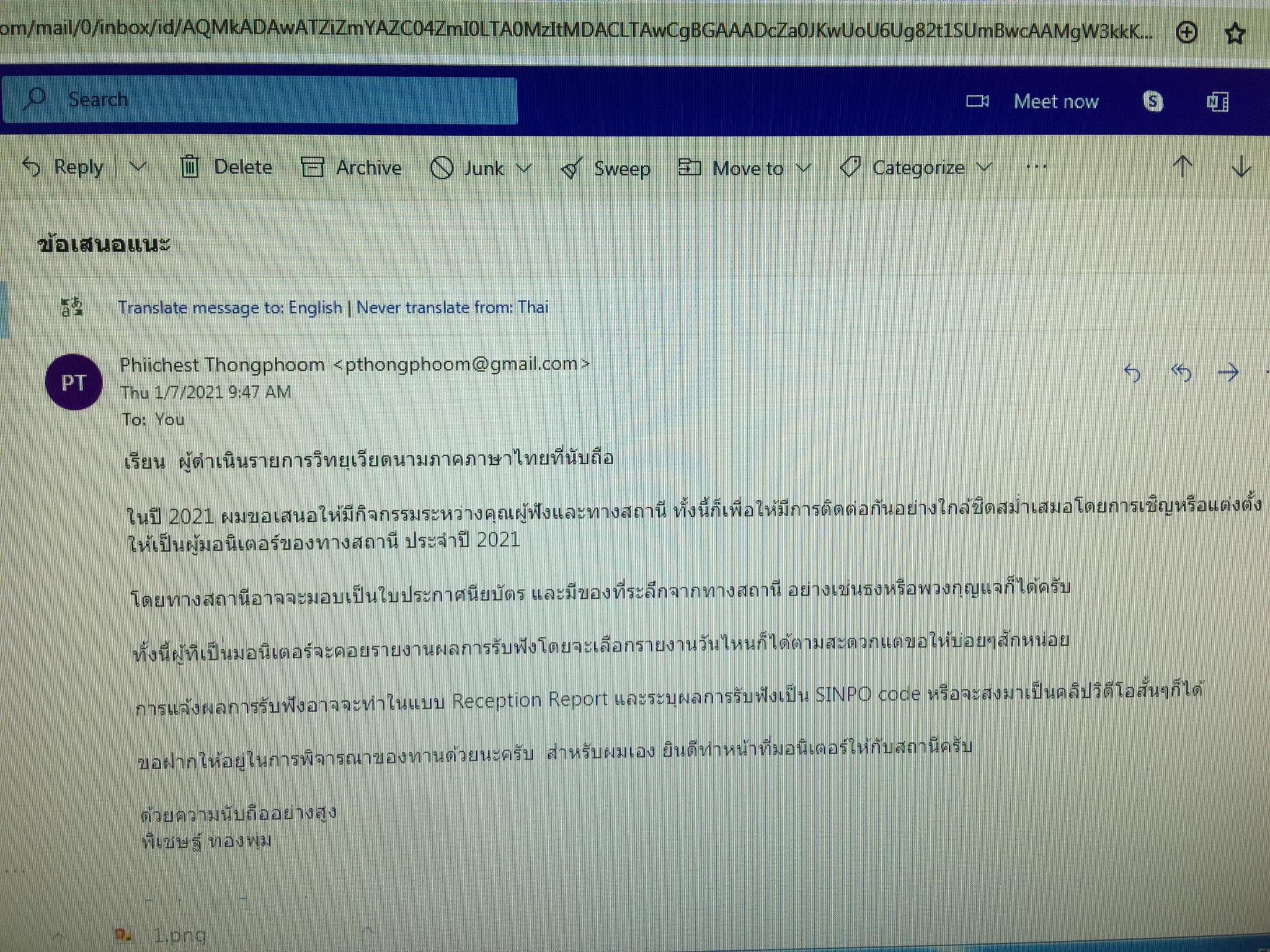 ต่อไปคืออิเมลของคุณ พิเชษฐ์ ทองพุ่ม ที่เขียนมาว่า “ในปี 2021 ผมขอเสนอให้มีกิจกรรมระหว่างคุณผู้ฟังและทางสถานี ทั้งนี้ก็เพื่อให้มีการติดต่อกันอย่างใกล้ชิดสม่ำเสมอโดยการเชิญหรือแต่งตั้งให้เป็นผู้มอนิเตอร์ของทางสถานี ประจำปี 2021 โดยทางสถานีอาจจะมอบเป็นใบประกาศนียบัตร และมีของที่ระลึกจากทางสถานี อย่างเช่นธงหรือพวงกุญแจก็ได้ครับ ทั้งนี้ผู้ที่เป็นมอนิเตอร์จะคอยรายงานผลการรับฟังโดยจะเลือกรายงานวันไหนก็ได้ตามสะดวกแต่ขอให้บ่อยๆสักหน่อย การแจ้งผลการรับฟังอาจจะทำในแบบ Reception Report และระบุผลการรับฟังเป็น SINPO code หรือจะส่งมาเป็นคลิปวิดีโอสั้นๆก็ได้ ขอฝากให้อยู่ในการพิจารณาของท่านด้วยครับ สำหรับผมเอง ยินดีทำหน้าที่มอนิเตอร์ให้กับสถานีครับ” นอกจากนี้ คุณ พิเชษฐ์ ท่องพุ่ม ยังได้รายงานผลการรับฟัง Reception Report ของสถานีวิทยุเวียดนาม VOV ในความถี่ 7285 kHz เมื่อวันที่ 9 มกราคมปี 2021 เวลาประเทศไทย: 19:30-20:00 ในตอนท้ายรายการมี fade นิดหน่อยแต่ยังฟังรู้เรื่อง