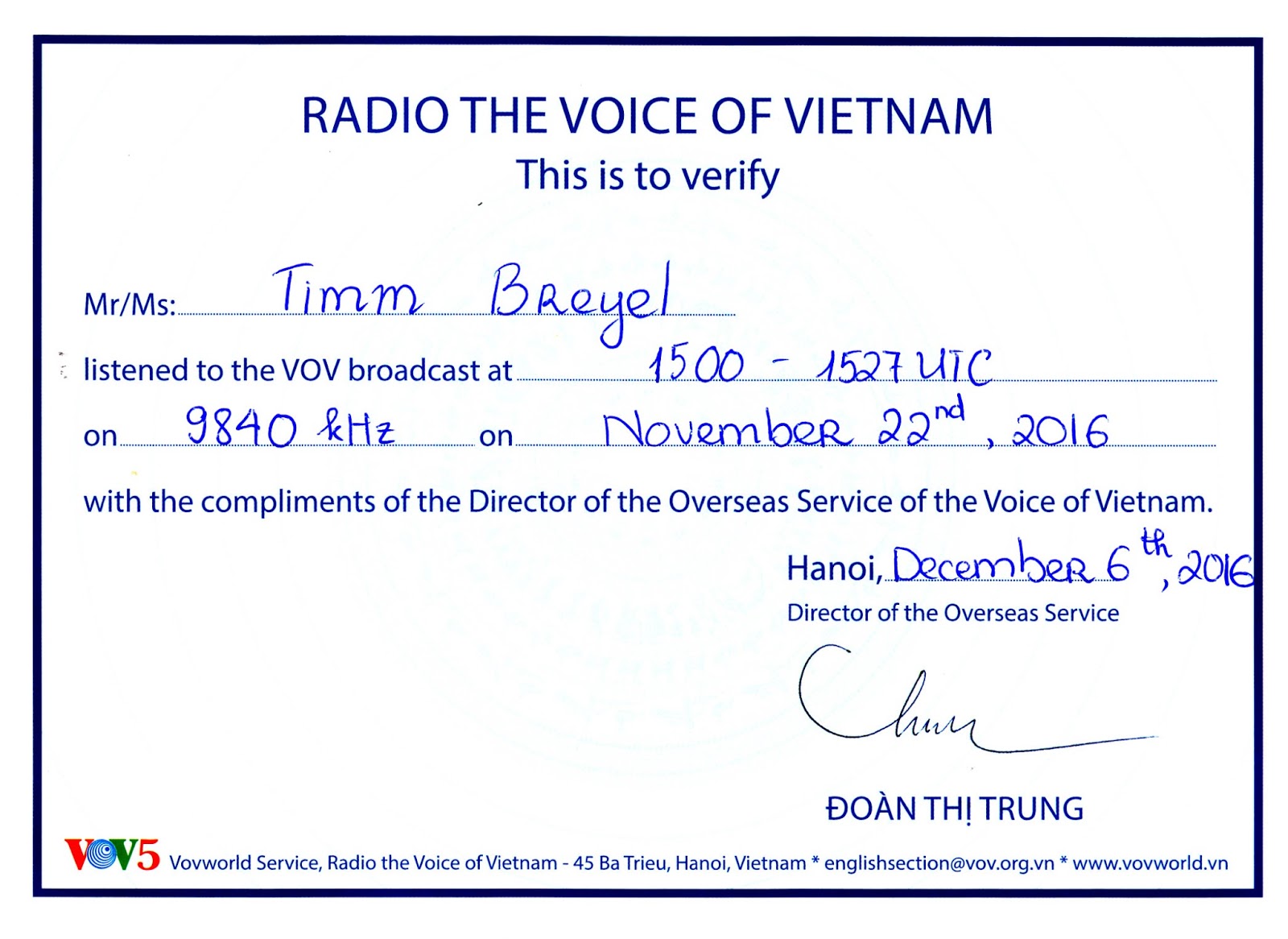 สำหรับข้อเสนอนี้ เราก็เห็นว่า นี่ก็เป็นเหมือน QSL ที่ทางเราจัดส่งให้ผู้ฟังและรับจากท่านผู้ฟังทั่วโลก จาก QSL เหล่านี้และจดหมายที่ท่านผู้ฟังส่งให้เราในแต่ละสัปดาห์ ถึงปลายปีเราจะมอบของที่ระลึกให้แก่แฟนพันธุ์แท้ ขอแสดงความยินดีเป็นอย่างมากที่ได้รับ Reception Report จากคุณ พิเชษฐ์ ท่องพุ่ม ทางเราก็หวังว่าจะมีท่านผู้ฟังอีกหลายๆท่านส่งให้เราเช่นกัน เพื่อให้เราปรับปรุงคุณภาพของคลื่นสัญญาณให้ดีขึ้นต่อไป