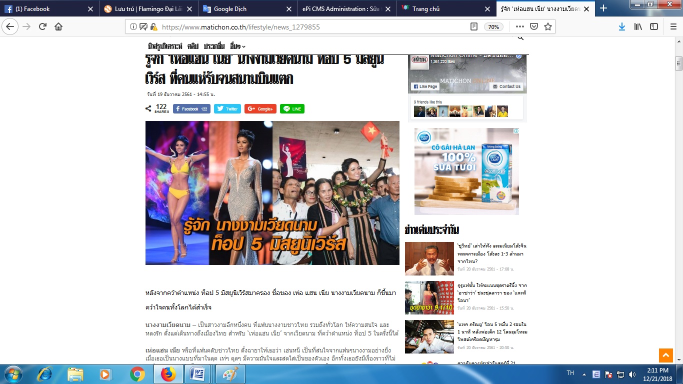 ส่วนข่าวดีอีกข่าวหนึ่งที่ได้รับความสนใจเป็นอย่างมากจากผู้ฟังและผู้ชมภาคภาษาไทยสถานีวิทยุเวียดนามเมื่อสัปดาห์ที่ผ่านมาคือการประกวดมิสยูนิเวิร์ส 2018 ณ กรุงเทพฯ แม้ไม่สามารถคว้ามงกุฎแต่มิสยูนิเวิร์สเวียดนาม เห่อแฮน เนีย ได้สร้างประวัติศาสตร์เป็นตัวแทนสาวงามคนแรกของเวียดนามที่ผ่านเข้ารอบ 5 คนสุดท้าย คุณ พิเชษฐ ทองพุ่ม คุณ ป้าภัส โชคดี คุณ Thunwarat Grace Thavonchotiwong และคุณ วุฒิพงษ์ มาลา ต่างบอกว่า เธอสวยมาก โดยเฉพาะคุณ Thunwarat Grace Thavonchotiwong คอมเมนท์ว่า “เธอควรได้ที่ 1 หรือรองอันดับ 1”