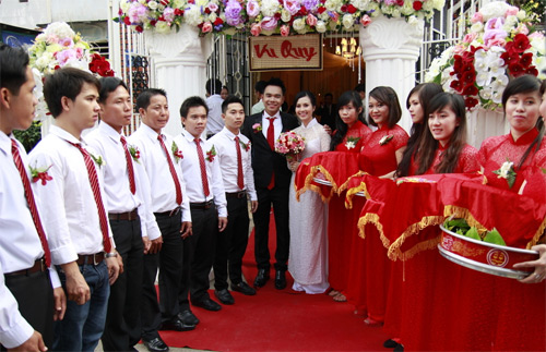 หลังงานหมั้นก็ถึงงานแต่งงาน ซึ่งโดยรวมแล้วประเพณีการแต่งงานของชาวเวียดดูเหมือนจะมีขั้นตอนไม่มากเท่ากับประเพณีการแต่งงานของคนไทยที่มีทั้งพิธีการกั้นประตูเงินประตูทอง นับสินสอด เชิญขันหมาก ไหว้ผู้ใหญ่ พิธีสวดพระพุทธมนต์ พิธีหลั่งน้ำพระพุทธมนต์และปราสาทพร ตลอดจนการจัดงานเลี้ยงแต่งงาน เป็นต้น ส่วนสำหรับพิธีแต่งงานของชาวเวียดนั้นก่อนขบวนการของฝ่ายชายมารับเจ้าสาวก็จะมีผู้ใหญ่ถือขันหมากเล็กๆที่มีหมากพลูร้อยชิ้นซึ่งเป็นสัญลักษณ์ของการใช้ชีวิตคู่มานานแสนนานเพื่อขอรับเจ้าสาวก่อน15นาที ส่วนในขบวนเจ้าบ่าวนั้นจะนำหน้าด้วยผู้อาวุโสในครอบครัว ก่อนรับเจ้าสาวไปจะต้องทำพิธีเซ่นไหว้บรรพบุรุษแล้วถือขันหมากร้อยชิ้นเชิญญาติมิตรทั้งสองฝ่าย สำหรับฤกษ์ยามของขบวนรับส่งเจ้าสาวก็ต้องเป็นไปในกรอบเวลาที่กำหนดและเมื่อถึงเรือนหอของฝ่ายเจ้าบ่าวก็จะทำพิธีไหว้บรรพบุรุษด้วยเช่นกัน
