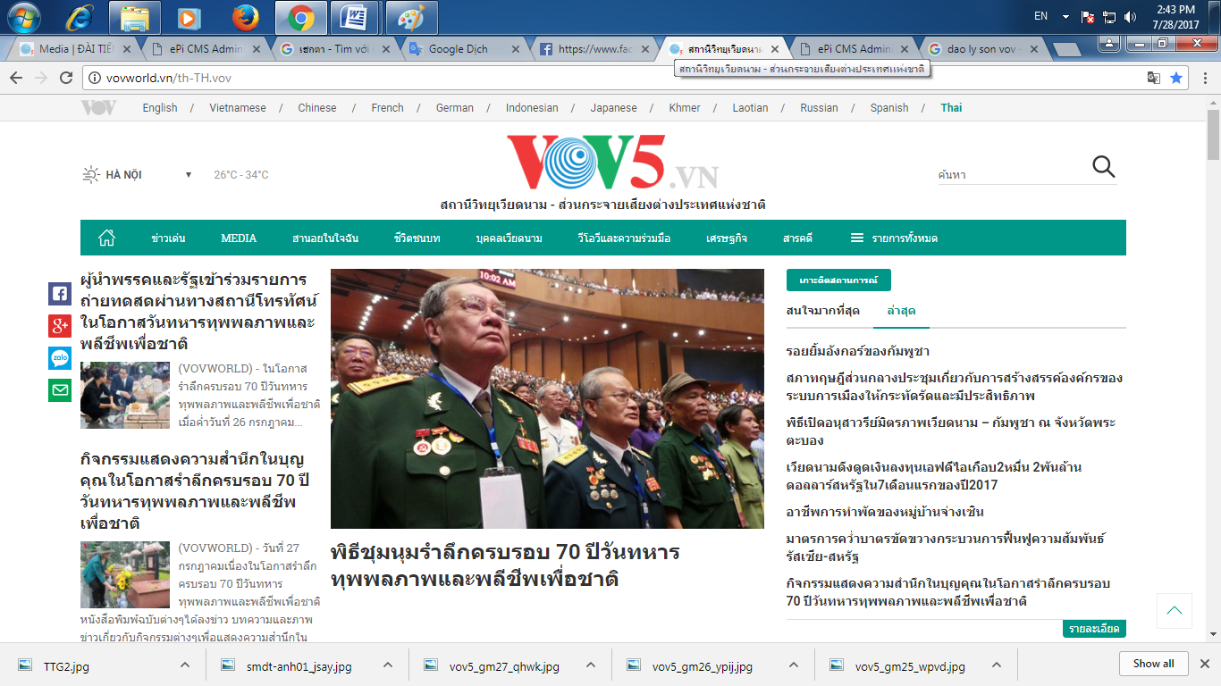 สัปดาห์ที่ผ่านมา ทางเราได้รับข้อเสนอจากผู้ฟังชาวจีนท่านหนึ่งว่า วีโอวี 5 ควรผลิตวีดีโอสั้นๆที่มีคำบรรยายแนะนำเอกลักษณ์วัฒนธรรม คนและสถานที่ท่องเที่ยวของเวียดนามเพื่อประชาสัมพันธ์บนเครือข่ายสังคมออนไลน์ ค่ะในรายการภาคภาษาไทยของเราได้มีการประชาสัมพันธ์แบบนี้เรื่อยๆค่ะ แม้ไม่ใช่วีดีโอที่ผลิตเองแต่เราก็มีการคัดเลือกอย่างระมัดระวัง ซึ่งส่วนใหญ่ใช้วีดีโอที่มีคุณภาพจากเว็บไซต์ที่เป็นทางการต่างๆ เช่น Svietnam ของสถานีโทรทัศน์เวียดนามและเว็บไซต์ของทบวงการท่องเที่ยวเวียดนาม นอกจากนี้ เรายังนำเสนอเพลงเวียดนาม มีรายการสอนภาษาเวียดนามวันละนิดและประมวลภาพค่ะ พร้อมทั้งจะแซร์ข่าวและบทความที่น่าสนใจต่างๆบน Fanpage Facebook ของรายการตามที่อยู่ Vov5 – สะพานเชื่อมระหว่างเวียดนามกับมิตรประเทศในทั่วโลก ขอเชิญท่านผู้ฟังเข้ามาชม