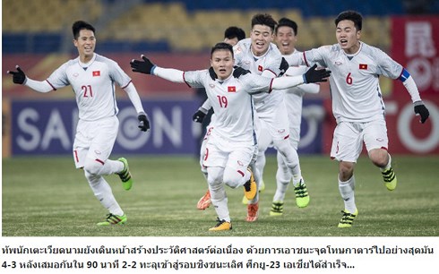 ท่านผู้ฟังคะ เมื่อเวลา 15.00 น. ของวันที่ 27 มกราคม ทีมยู 23 เวียดนามได้แข่งขันกับทีมยู23 อุซเบกิสถาน ถึงแม้แพ้ทีมยู 23 อุซเบกิสถาน แต่ผลงานของทีมยู 23 เวียดนามในการแข่งขันชิงแชมป์เอเชียได้เข้าสู่ประวัติศาสตร์ฟุตบอลเวียดนามและเอเชียตะวันออกเฉียงใต้ เนื่องจากเป็นทีมฟุตบอลเดียวในภูมิภาคที่ได้ผ่านเข้ารอบชิงชนะเลิศการแข่งขันชิงแชมป์เอเชีย ผลงานของทีมยู 23 เวียดนามเป็นสิ่งที่น่ายกย่องและให้กำลังใจ