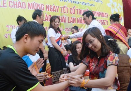 (VOVworld )-บ่ายวันที่ ๑๒ เมษายน มหาวิทยาลัยวินห์ ภาคกลางประเทศเวียดนามได้จัดงานเทศกาลบุญปีใหม่ของลาวและสงกรานต์ของไทยให้แก่นักศึกษาลาวและไทยที่กำลังศึกษาในมหาวิทยาลัย โดยจัดตามประเพณีดั้งเดิมคือ การรดน้ำขอพรผู้ใหญ่ ผูกข้อมือและรายการแสดงศิลปะที่โดดเด่นตามประเพณีโดยนักศึกษาลาว ไทยและเวียดนามเป็นผู้แสดง