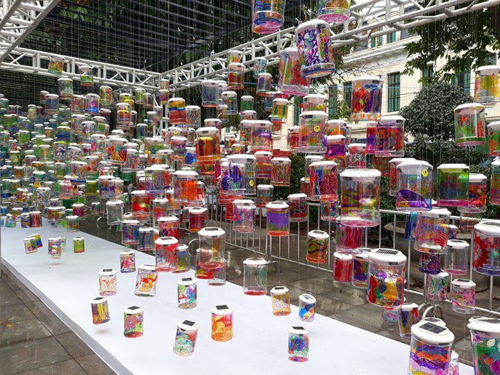 ส่วนกิจกรรมที่เป็นไฮไลท์พิเศษของงานคือการแสดงผลงานศิลปะ “Rainbow Connection” ซึ่งเป็นกล่องคุกกี้พลาสติกทาสีและภายในติดหลอดไฟพลังงานแสงอาทิตย์แขวนไว้ข้างบนเพื่อสร้างบรรยากาศโรแมนติกของทะเล ป่าไม้และเมฆ คุณเฟือง นักท่องเที่ยวจากจังหวัดนามดิ๋งและคุณลิงห์ นักศึกษาได้แสดงความประทับใจว่า “น่าประทับใจมาก กล่องแบบนี้ก็สามารถทำเป็นหลอดไฟเพื่อใช้ตกแต่งภายในบ้านในช่วงค่ำคืนได้ ซึ่งใช้พลังแสงอาทิตย์ที่ถือเป็นพลังงานสะอาดเพื่ออนุรักษ์สิ่งแวดล้อม”